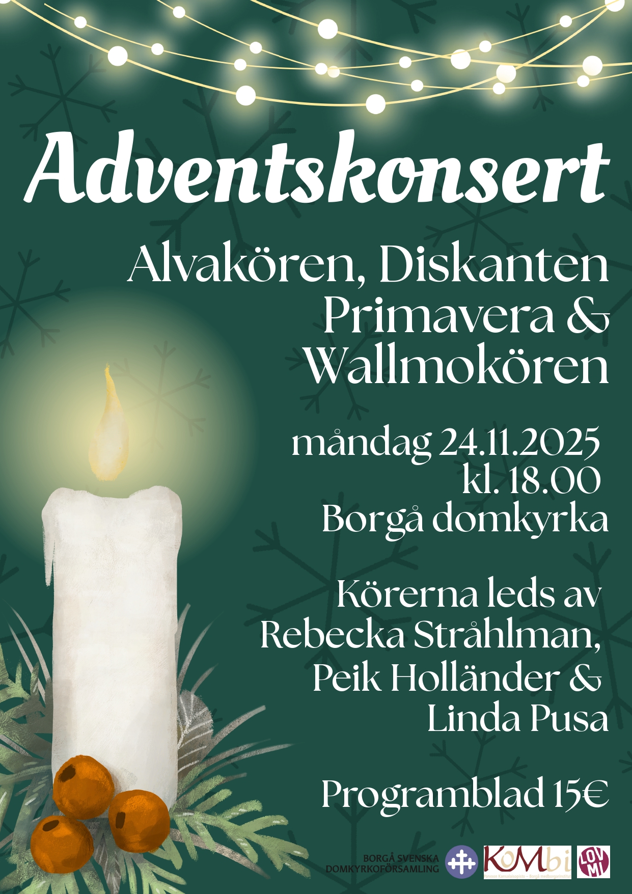 Välkommen på Adventskonsert måndagen den 24.november kl. 18 i Borgå domkyrka. Medverkande är: Alvakören, Diskanten, Primavera och Wallmokören. Fritt inträde, programblad 15 €.